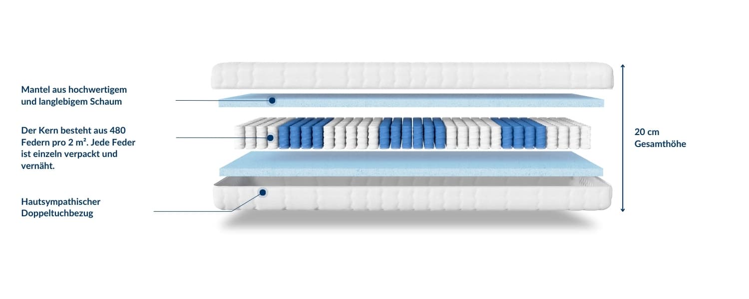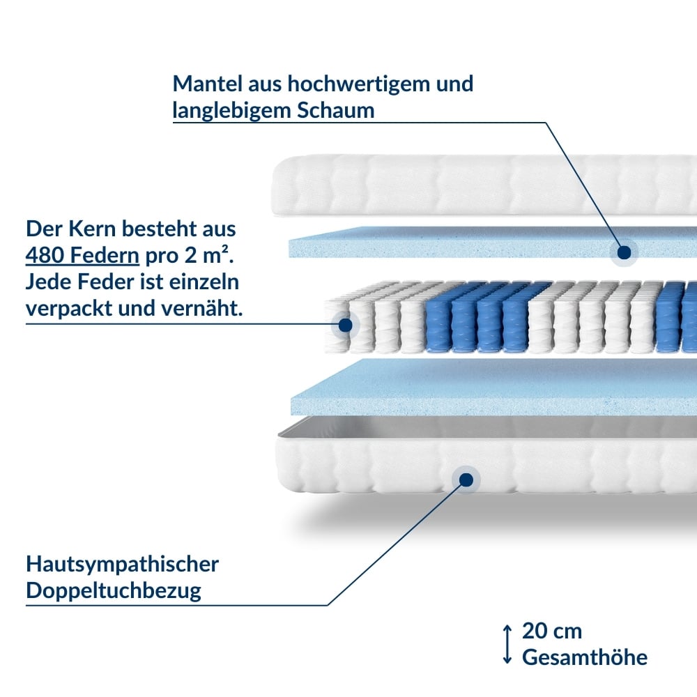 - Kern aus 480 Tonnentaschenfedern pro 2 m² – einzeln vernäht für solide Punktelastizität