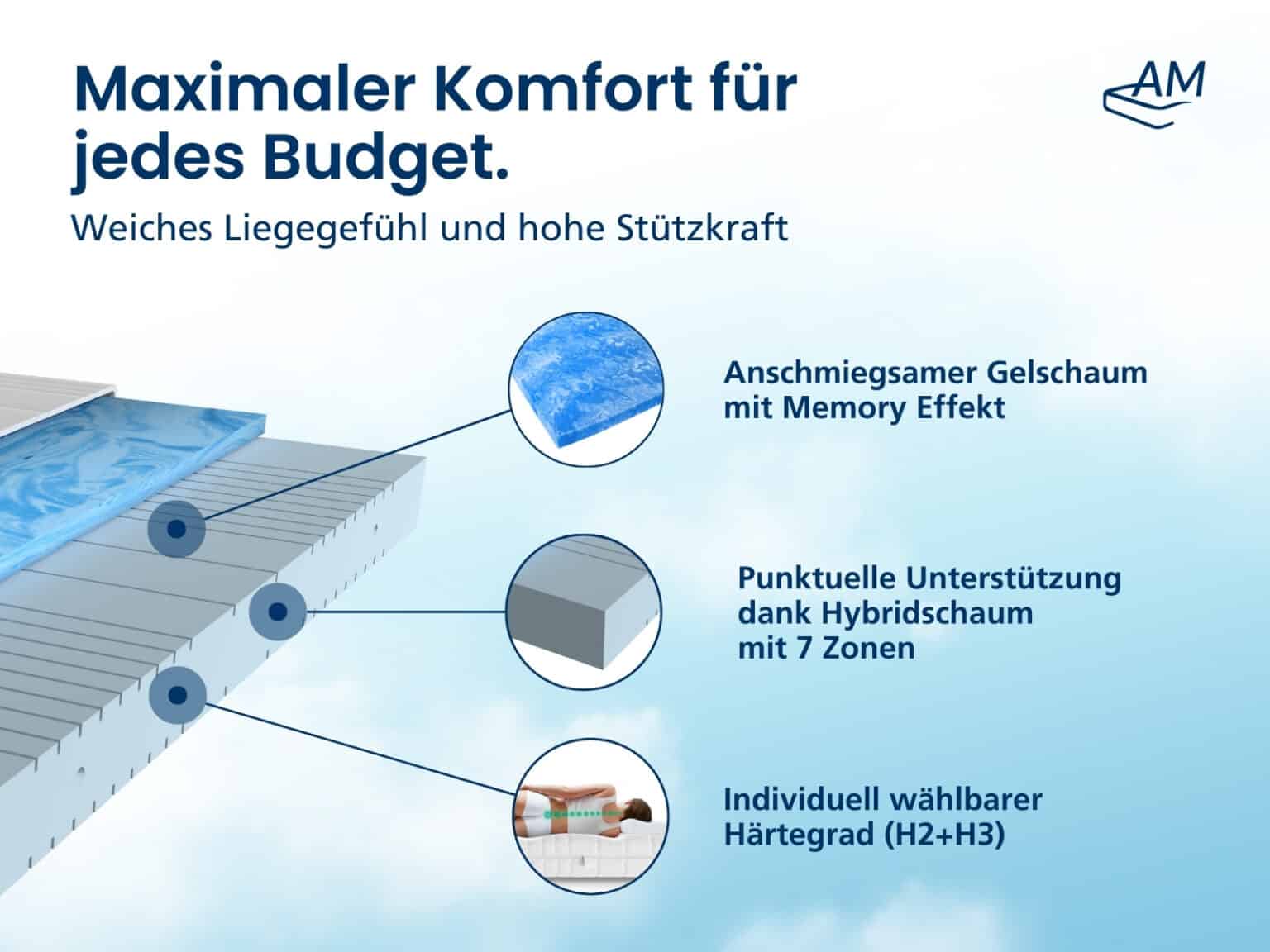 - 4 cm Gelschaum-Schicht (RG50) mit Memory-Effekt für weiches Einsinken