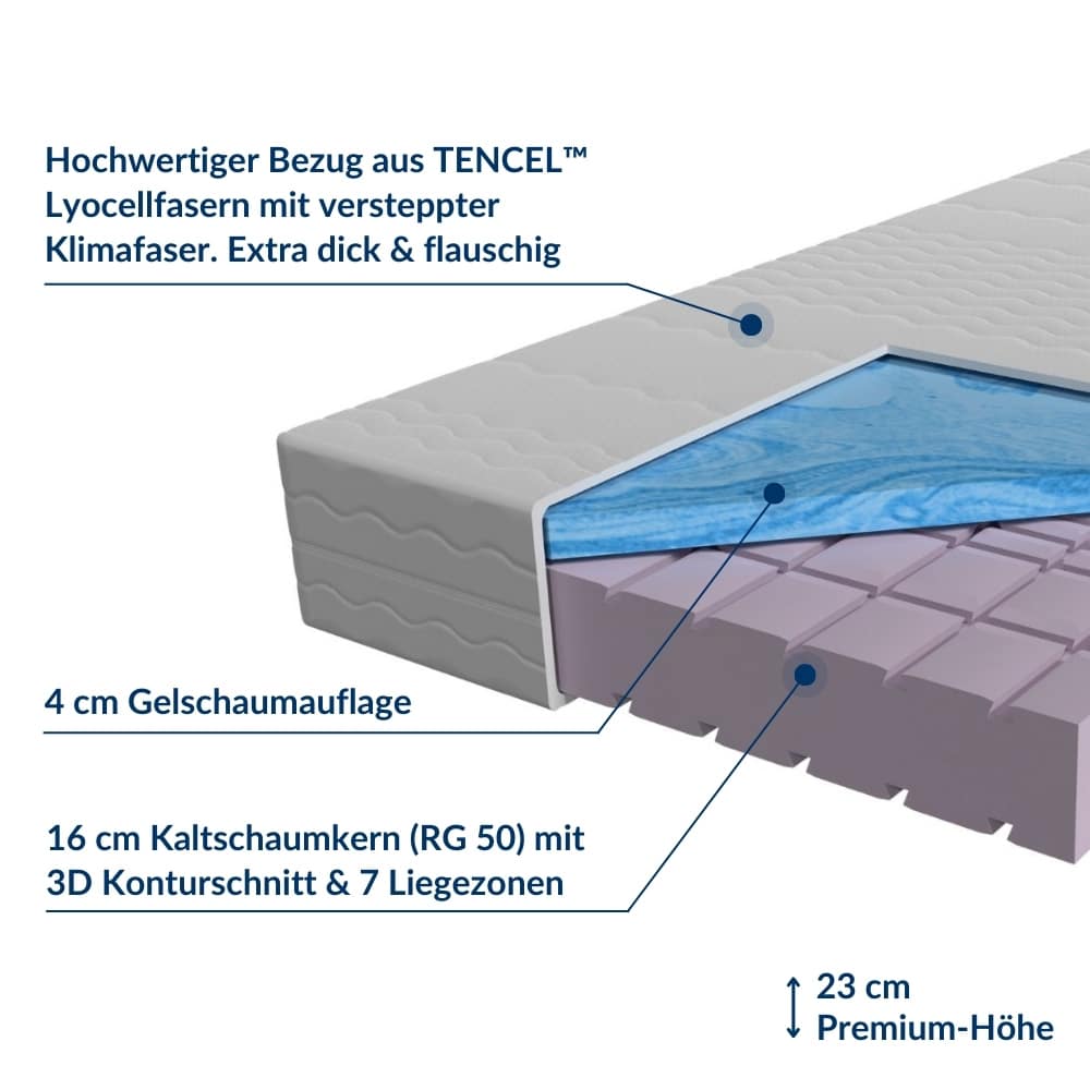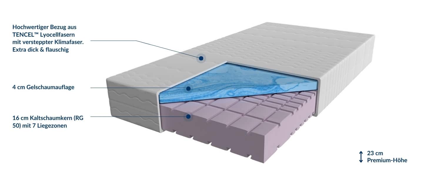 Abgerundet wird die hochwertige Matratze vom angenehm weichen TENCEL™ Lyocell-Bezug.